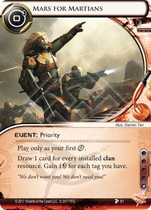However, tag punishment was not the only thing that had changed in the interim years. The ability for the runner to give themselves tags, as well as the rewards for doing so, had also been greatly expanded. This resulted in so-called “tagme” decks, that piled up tags for rewards that scaled with the amount of tags they got. Perhaps most famously, Mars for Martians had to be banned because of its uncapped nature. Even now, it is on the Eternal points list.