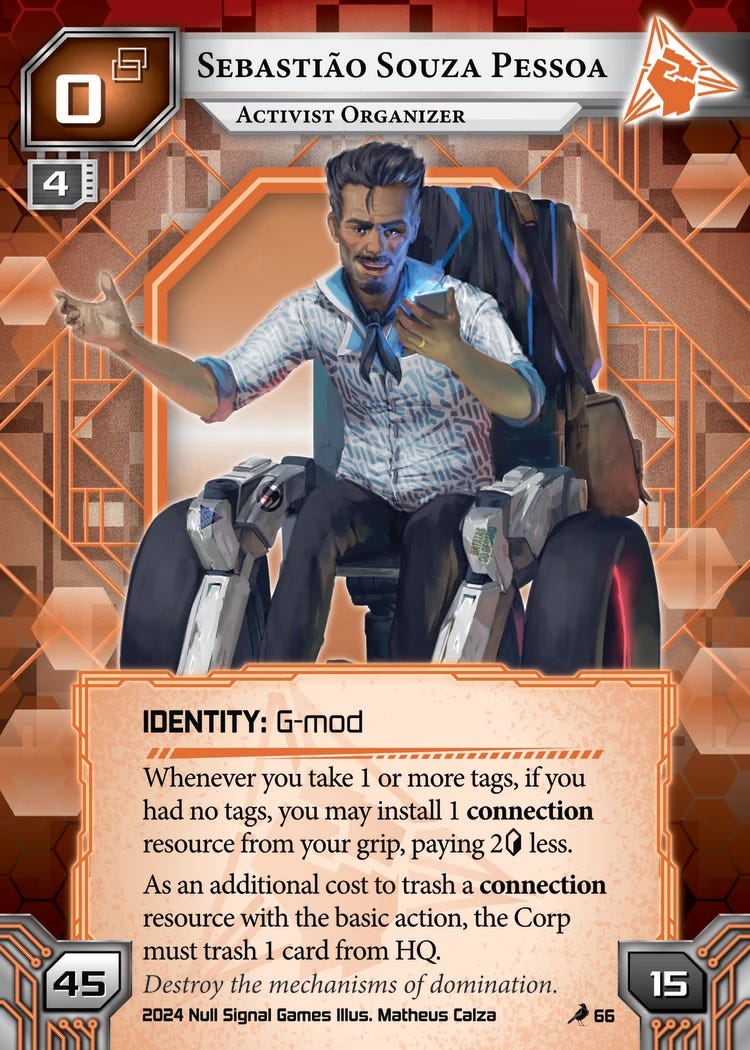 What I mean by that is that when using a tag as a cost, as on many of these cards, there’s a default cost associated with clearing it. That being two credits and a click. However, both Sebastião and Vic change this value proposition, in Seb’s case by giving you a freebie, and in Vic’s case by offering a discount and a card.