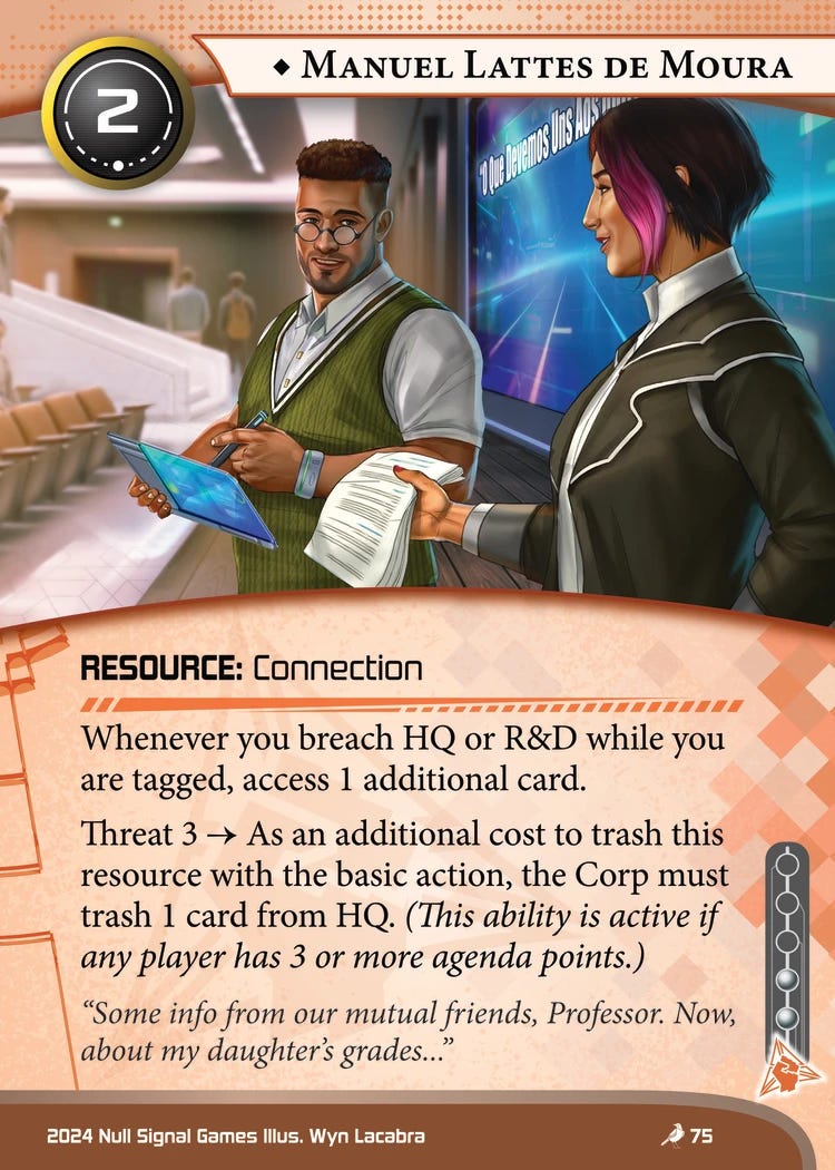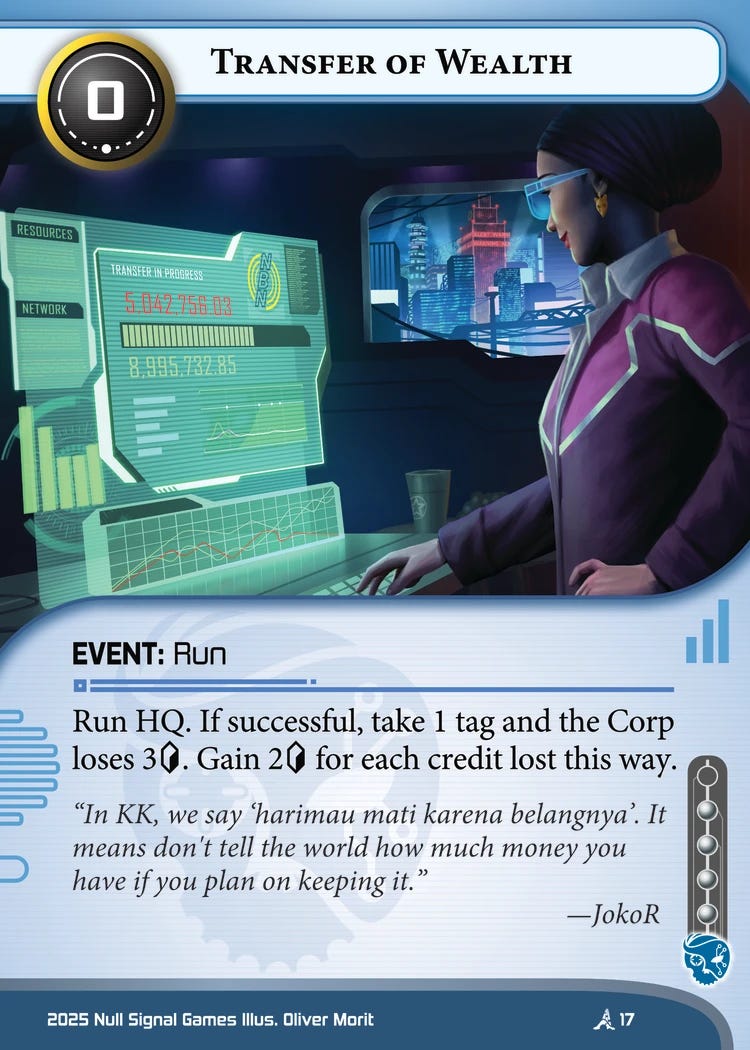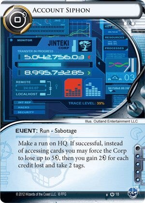 I would like to take you back over a decade. The year is 2012. You’re playing this brand-new card game called Android Netrunner. You’ve heard this card Account Siphon is pretty good, so you slam it down onto the table with a smile. Your opponent subtracts five from their credit total, and you gain a whopping ten.