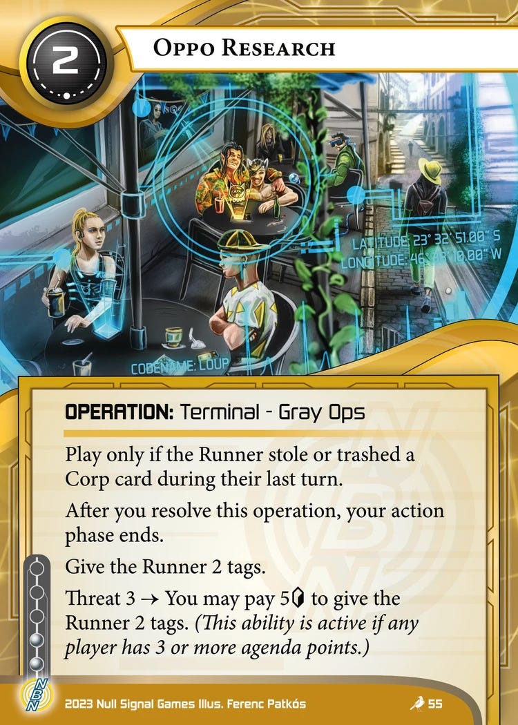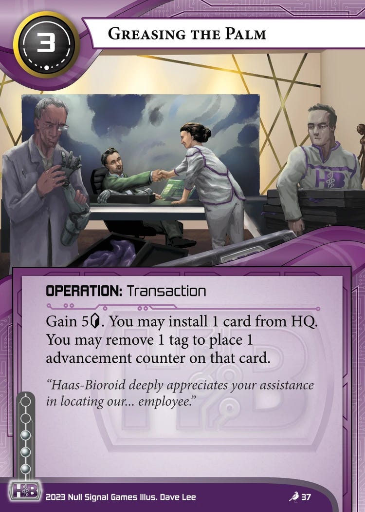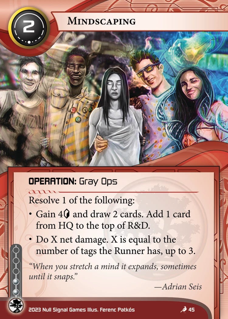 However, if your runner opponent does have tags, both of these cards gain powerful effects for their respective factions. Suddenly, your Greasing the Palm becomes a credit-positive fast advance tool. And while a single Mindscaping with one tag isn’t much of a threat, woe the runner who thinks they can float three tags against Jinteki with no consequences.