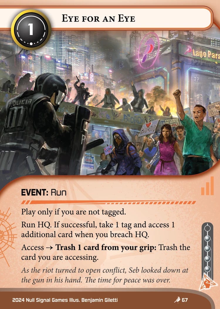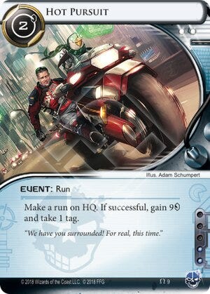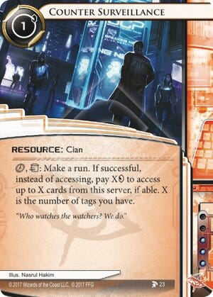 Between Obelus for additional hand size and Jarogniew Mercs for meat damage protection, getting flatlined was often only of minor concern. Meanwhile, cards like Counter Surveillance and Hot Pursuit provided powerful rewards for those willing to take the tags.