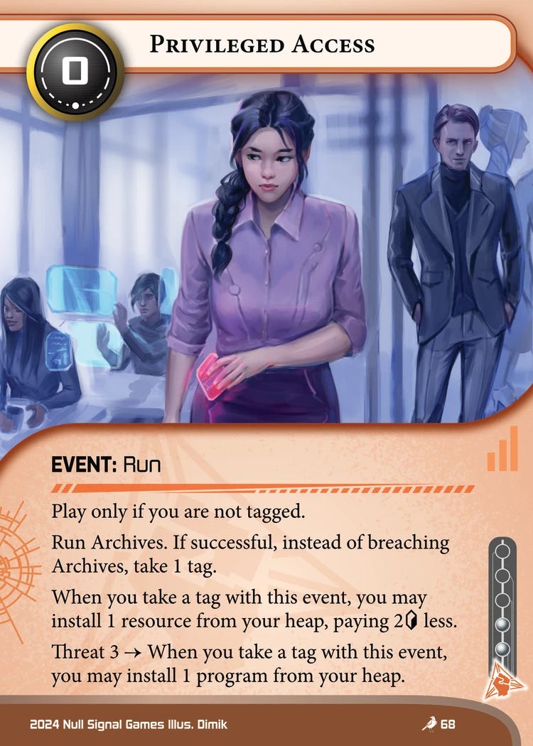 Privileged Access is a powerful recursion effect, especially once you hit threat 3. At only 2 influence, this is fine to splash into a deck. Being able to recur a connection could be a good way to turn Friend of a Friend into more economy, but that’s only the start. With this in your deck, limited-use breakers like Revolver or Propeller become much more appealing, getting an extra use at a bargain rate.