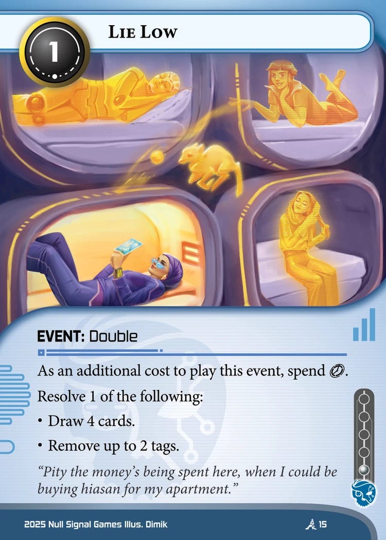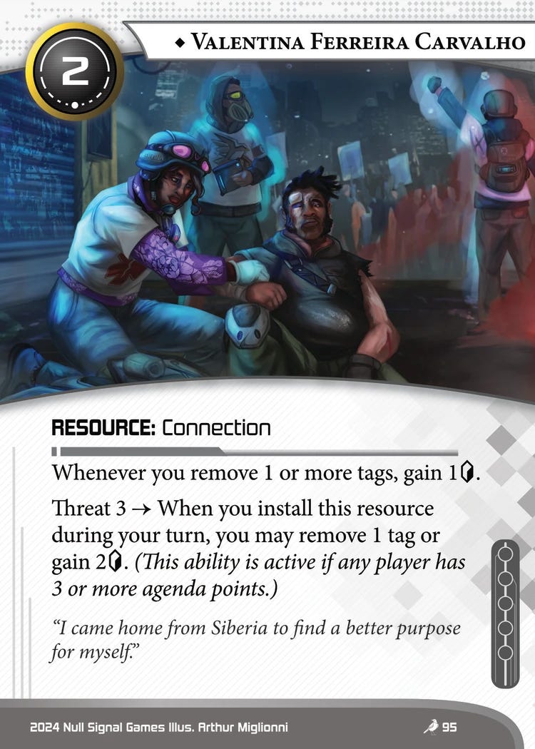 One final observation is that Vic’s ability can only be used once per turn, which creates opportunities both in designing corp cards that pressures through multiple tags, or in other tag removal cards that deal with multiple tags at once.