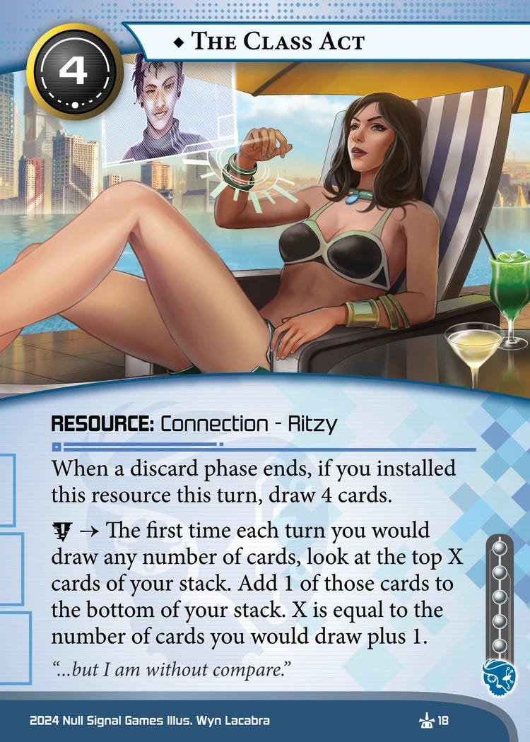Because one of the fundamental problems with tags is that the only punishment available by default, the basic action, targets a certain card type. And so, these decks simply did not play any resources that needed to stick around. Sure, if the corp wants to spend two credits and a click to trash The Class Act, the runner already got their four cards.