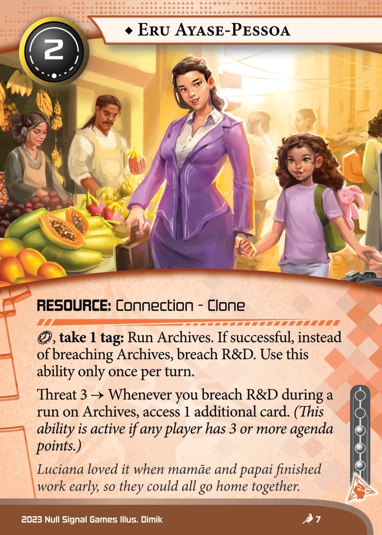 Eru Ayase-Pessoa might be the best card we have for Vic so far. Both their abilities are limited to once per turn, and it provides a strong degree of pressure on the corp while allowing you to keep drawing through your deck at a reasonable pace. While the three influence is a bit of a sting, I imagine a lot of Vic decks will want to play Eru.