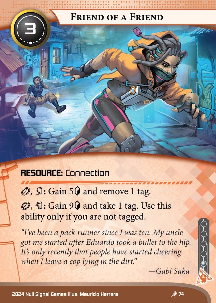First up is Friend of a Friend, and it isn’t great. Without Sebastião’s ability to discount and clicklessly install, this card costs three credits and a click to install. Then a click and a tag to gain nine credits, a net of six. Finally, we use Vic to clear the tag and draw a card, at the cost of another click and a credit.